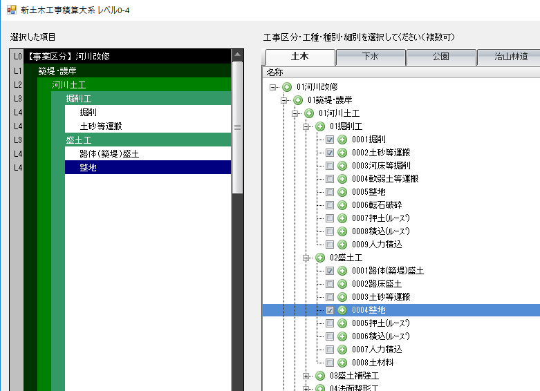 土木・下水・公園・農林 工事工種体系搭載(マルチ選択機能実装)