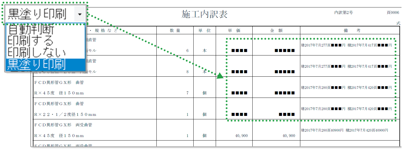 公表しない単価に“黒塗り印刷”設定をすることで情報開示請求に対応した設計書を印刷します。