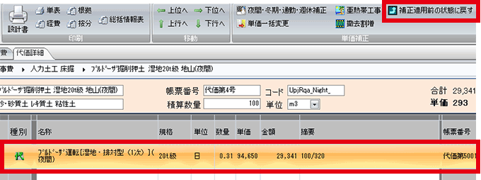 補正適用後に単価や名称を変更していた場合、補正を元の状態に戻すと、完全に補正適用前と同じ状態に戻ってしまいます。単価や名称を変更する前の状態になるのでご注意ください。