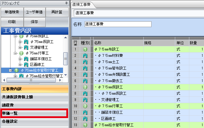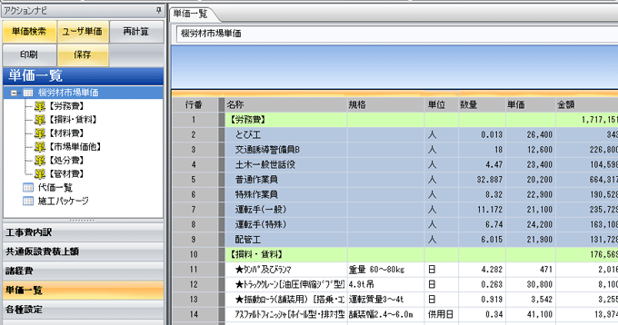 上記「2」の手順で“「物価更新」を更新”や“「機械損料」を更新”を選択することで物価資料などの単価を変更することも可能です。