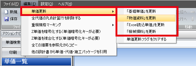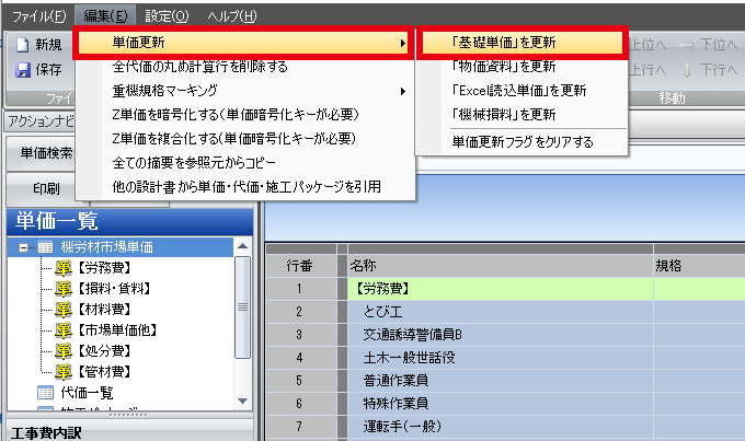 ツールバーの編集をクリックし、表示されるメニューから 単価更新→「基礎単価」を更新をクリックします。
