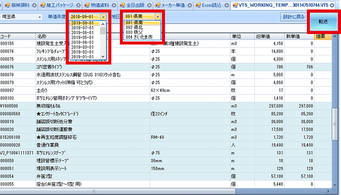 単価検索の画面が起動してきますので、単価年度や地区を更新したい年度と地区に設定し、転送ボタンをクリックします。