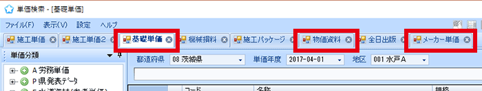 頂に搭載されている材料単価は、3種類のタブに分けて掲載しています。タブを切り替えて、材料単価の検索をお試しください。