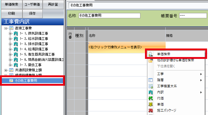 右クリックでメニューを呼び出し、単価検索を起動します。