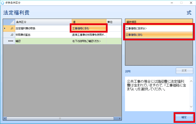 [工事価格に含む]をクリックすると、選択項目に選択肢が表示されますので適切なものを選択し、確定をクリックします。
