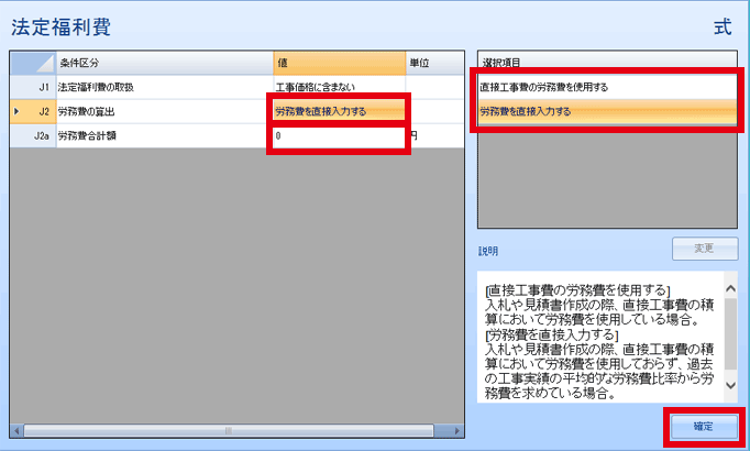 [労務費を直接入力する]をクリックすると、選択項目に選択肢が表示されますので適切な物を選択し、確定をクリックします。
