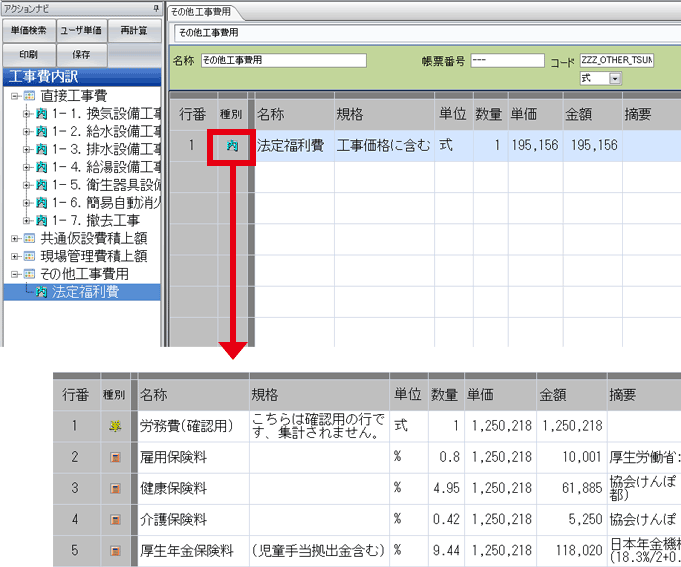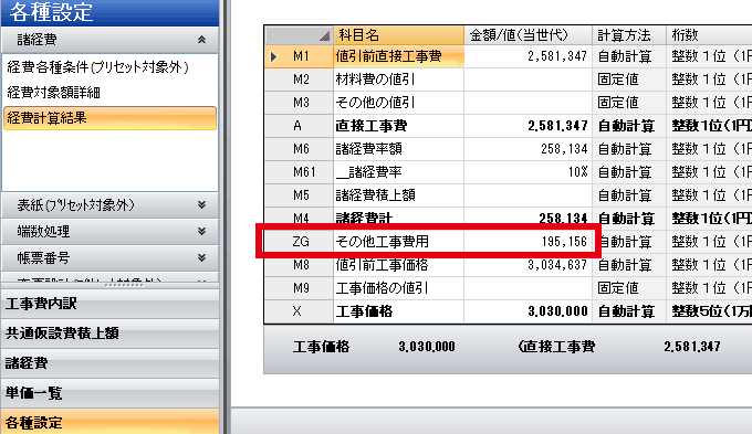 諸経費計算結果の画面で、法定福利費がその他工事費用に計上されていることをご確認いただけます。