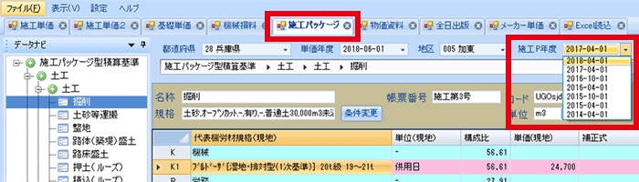 単価検索の「施工パッケージ」タブを選び、「施工P年度」のプルダウンから適切な施工パッケージ年度を選択します。