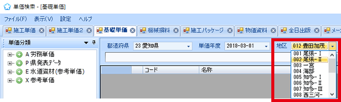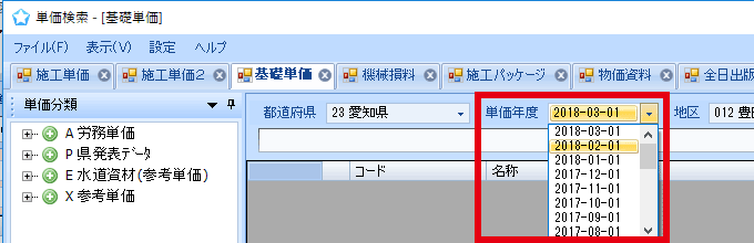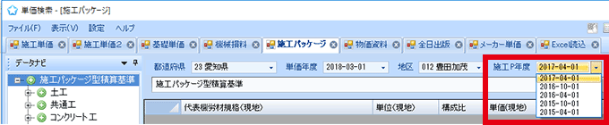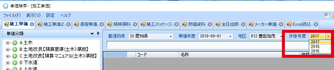 発注された設計書や特記仕様書などに、「単価年度」が明記されていることがあります。それに合わせて「単価検索」の年度などを設定してください。