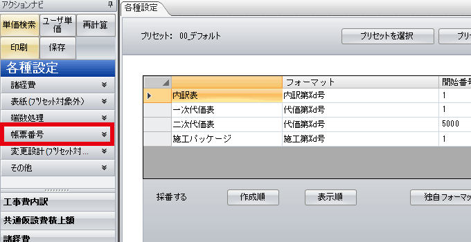 代価表の採番をやり直す場合は開始番号を選択し、採番方法を以下の2種類から選択する。