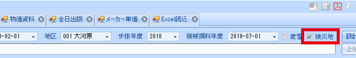 単価検索で「施工単価」「施工単価2」「施工パッケージ」等のタブを開き、[被災地[のチェックボックスにチェックを入れる。