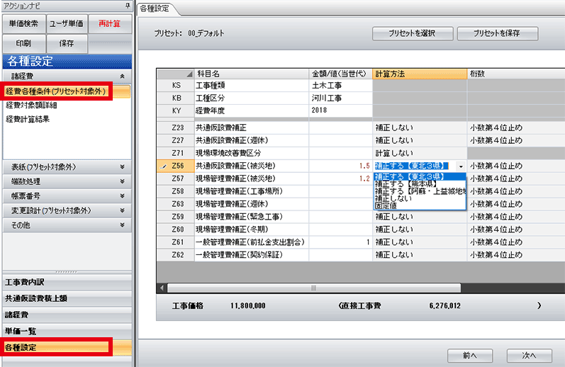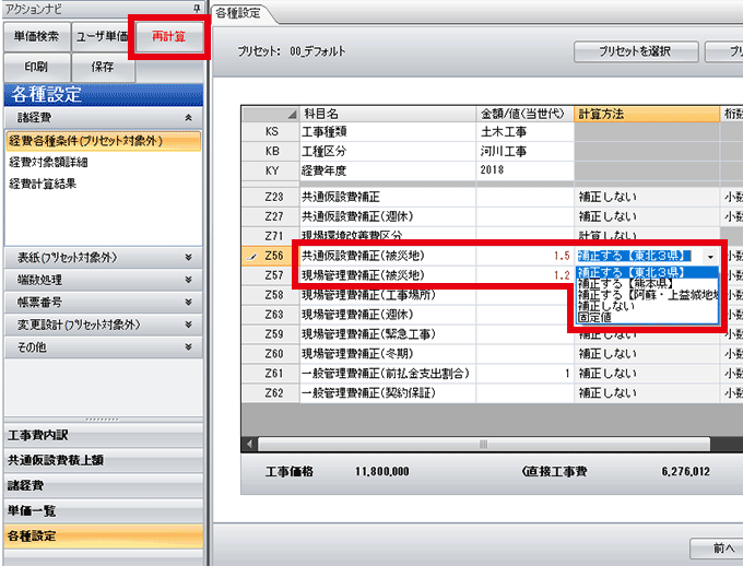 [共通仮設費補正(被災地)]または[現場管理費補正(被災地)]のどちらか適切なものを選択→[再計算]をクリック。