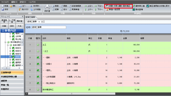 直接工事費の画面を開き、コマンドバーの[夜間・冬期・通勤・週休補正]をクリックします。