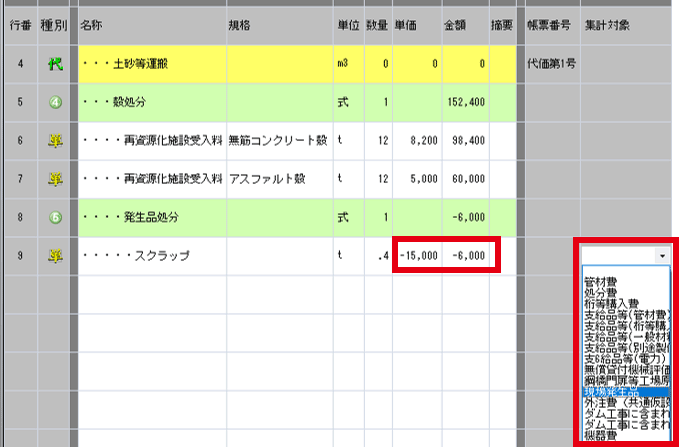 該当行の「集計対象」列をクリックし、プルダウンから[現場発生品]を選択する。