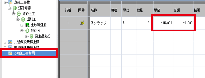 工事費内訳画面のツリー下部にある[その他工事費]をクリックし、スクラップ費をマイナスで入力する。