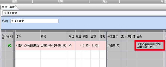 積算ソフト頂にはその歩掛の根拠となる出典が表示されます。(一部表示されないものもあります。)