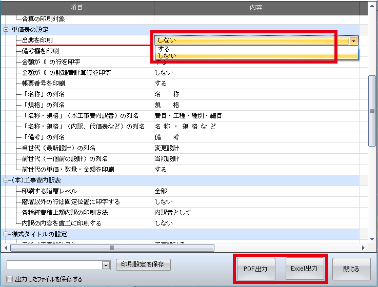 「出典を印刷」で[しない]を選択し、[PDF出力]または[Excel出力]のどちらかをクリックする。