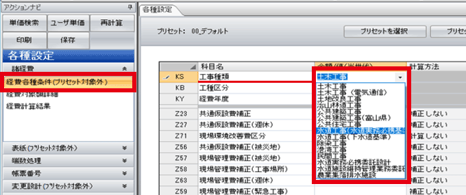 「経費各種条件」をクリックしてから、「工事種類」を選択する。