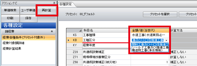 同様に「工種区分」を選択してから、[再計算]をクリックする。