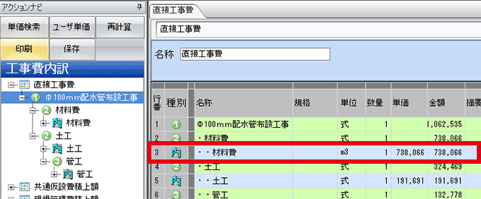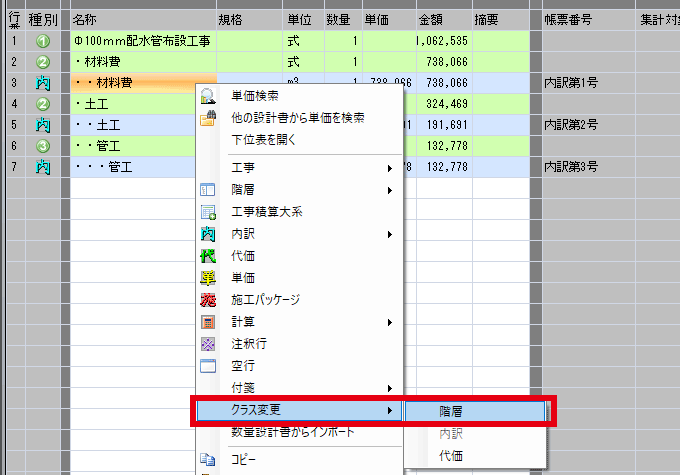 - 階層 → 内訳→代価