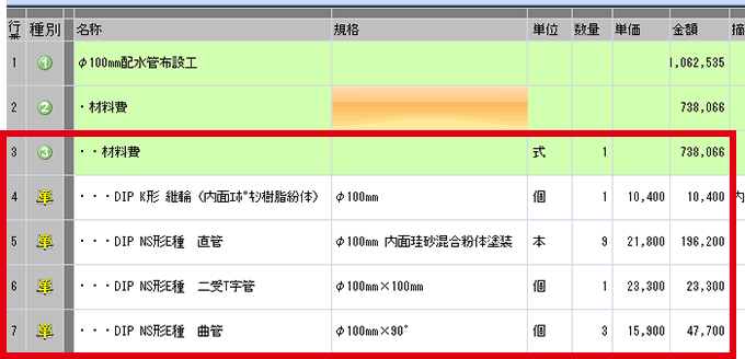 例として、以下の設計書は材料費が内訳で作成されています。赤線で示した内訳を階層に変更してみます。