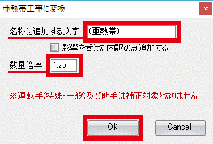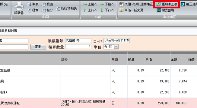 補正したい歩掛等の下位表まで移動してから、[亜熱帯工事]をクリックして設定を開く。