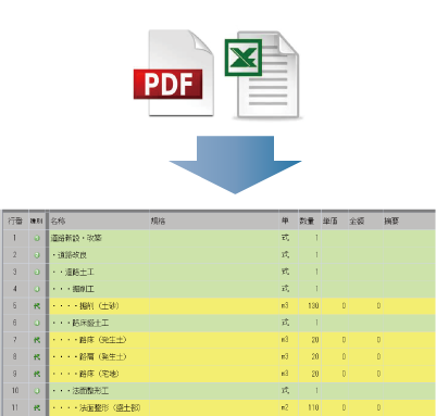 発注者の設計書データ(Excel/PDF)を取り込んで積算が行えます。名称、単位、数量を取り込むことができるので積算にかかる作業時間がグッと短縮できます。