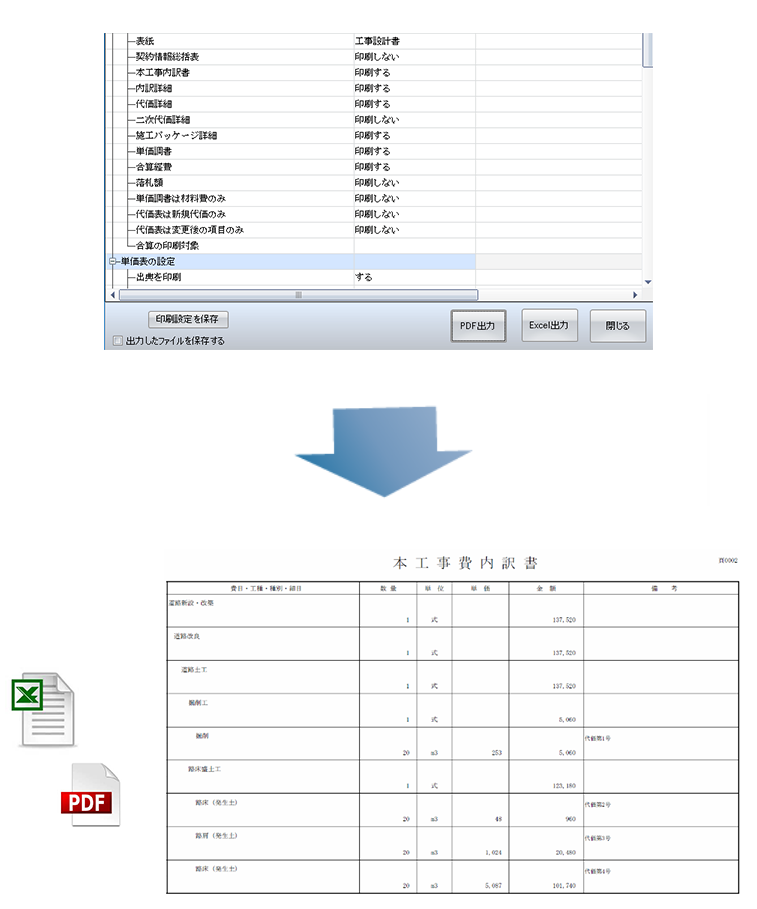 ボタンひとつでPDF、Excelファイルに出力できます。Excel変換機能を有料オプションとしているソフトもありますが、「頂」では標準装備。発注者様式にあわせた柔軟な印刷設定も可能です。