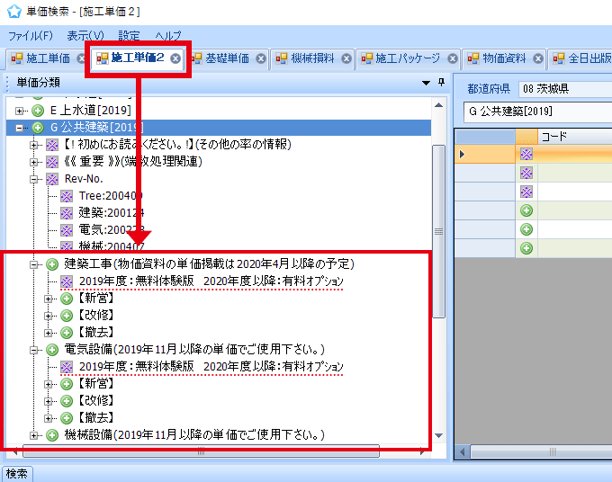 本オプションの加入がない場合2020年度版より、「施工単価2>G公共建築>建築工事・電気設備」に搭載されているデータ(複合単価・市場単価)等は利用できなくなります。