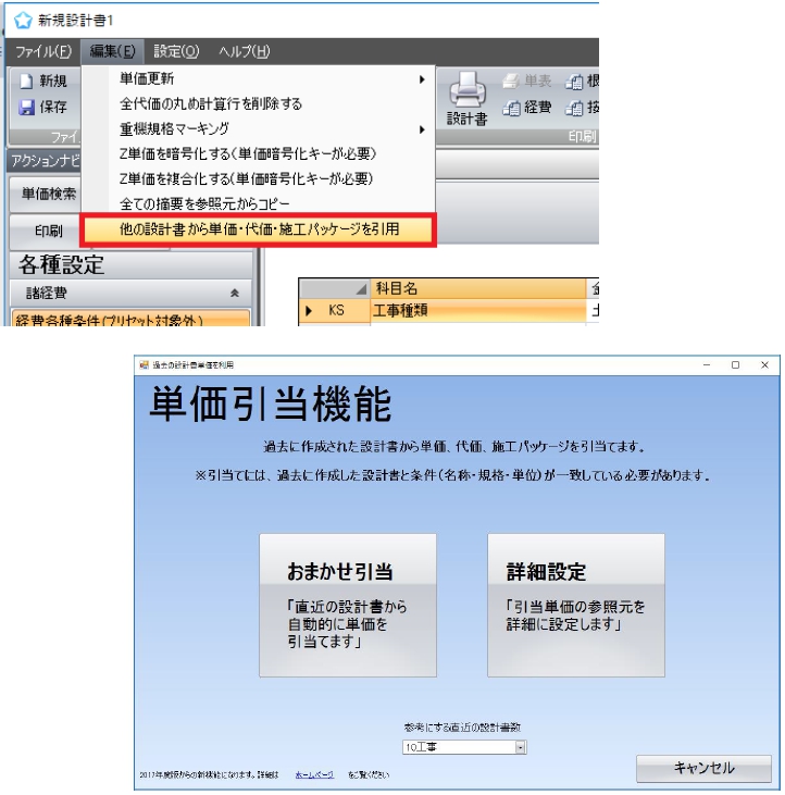 この機能を使用することで、過去に作成した設計書から単価・代価・施工パッケージを引当てることができます。