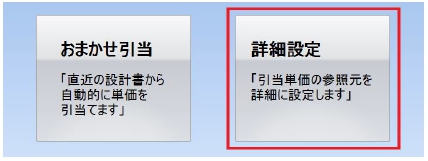 単価引当機能画面の「詳細設定」を選択することで、参考にする設計書や項目を詳細に設定できます。