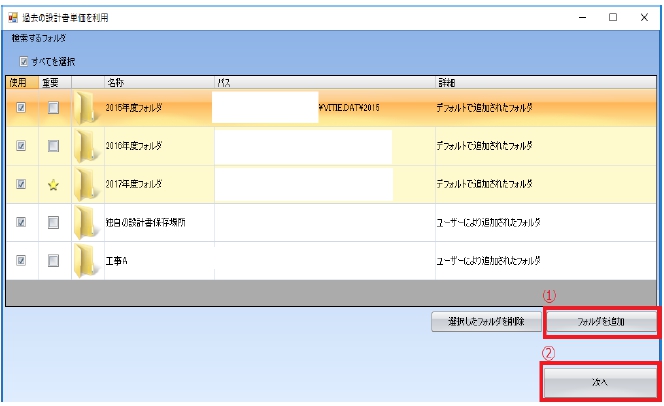 ① 設計書を独自のフォルダに保存している場合は「フォルダを追加」ボタンから検索フォルダに追加します
