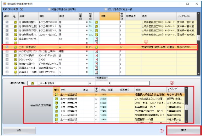 ※ 本機能は過去に作成した設計書から単価を引当てる機能です。設計書作成時点の単価として正しいとは限りません。引当て後に確認をして頂く必要があります。