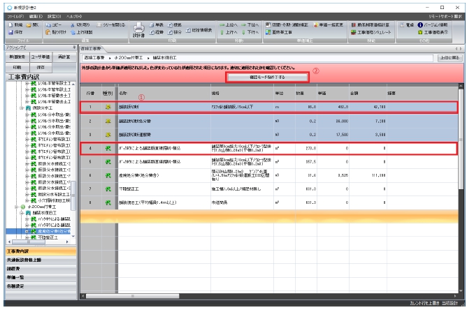 単価引当機能が実行された後、設計書は「確認モード」となります。確認モード中は、適用された項目のみ背景色が塗りつぶされます。