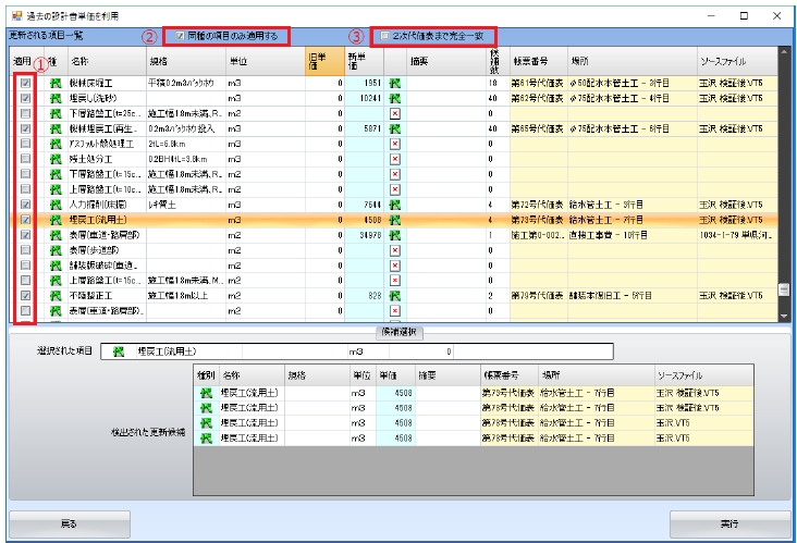 すべての適用単価を選択後、実行ボタンを押すことで単価が設計書に適用されます。