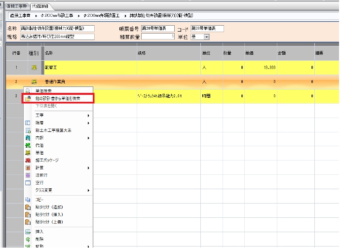 単価を右クリックし「他の設計書から単価を検索」を選択することで、選択した項目に対して個別に単価引当機能を利用できます。